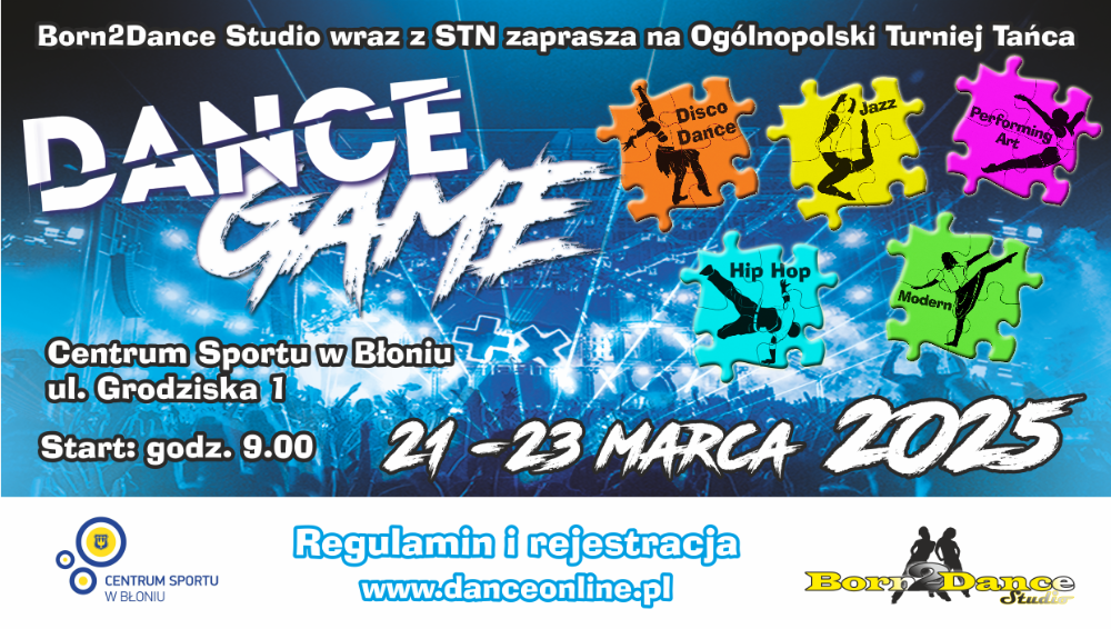 Niezmiernie miło nam poinformować, że w dniach 21-23 marca 2025 r w gościnnych progach Centrum Sportu w Błoniu ,odbędzie się Ogólnopolski Turniej Tańca pod nazwą „DANCE GAME 2025 ”. Koniecznie bądźcie z nami , aby zagrać w naszą taneczną gręw następujących konkurencjach:- Disco Dance - solo, duety,- Disco Dance - Mini Formacje i Formacje (Easy i Open)- Hip Hop - solo, duety,- Hip Hop - Mini Formacje i Formacje (Easy i Open)- Hip Hop Lyrical Improvisation - HIL solo- Performing Art Improvisation - solo PAI Jazz, solo PAI Modern- Jazz - Mini Formacje i Formacje (Easy i Open)- Modern - Mini Formacje i Formacje ( Easy i Open)- Inne Formy Tańca - Mini Formacje i Formacje- Formacje OPEN 31+ - bez podziału na styl tanecznyRegulamin i rejestracja na www.danceonline.plBędzie nam niezmiernie miło gościć Was na naszym turnieju . Obiecujemy dobrą organizację i wspaniałą atmosferę.OrganizatorzyMałgorzata i Mariusz Mikołajek