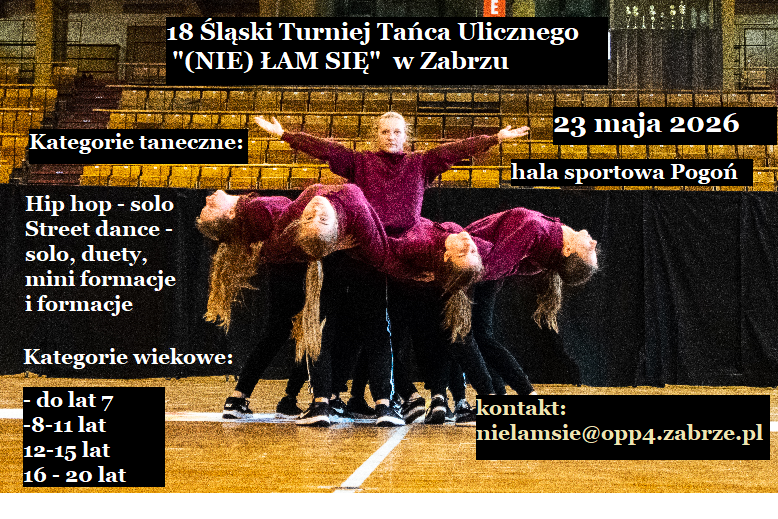 “(Nie) Łam się” to najstarszy na Śląsku turniej tańca ulicznego. Po raz pierwszy odbył się w 2005 roku. Zapraszamy kluby i tancerzy nie tylko z naszego regionu, ale z całej Polski. Nasze jury reprezentuje różne pokolenia tworzące street dance w Polsce od ponad 30 lat, i różne rejony Polski. Muzykę do kategorii solo od eliminacji aż po finałowe walki gra Dj. Wszyscy zwycięzcy kategorii (prócz kategorii solo hip hop do lat 7) otrzymują nagrody finansowe.