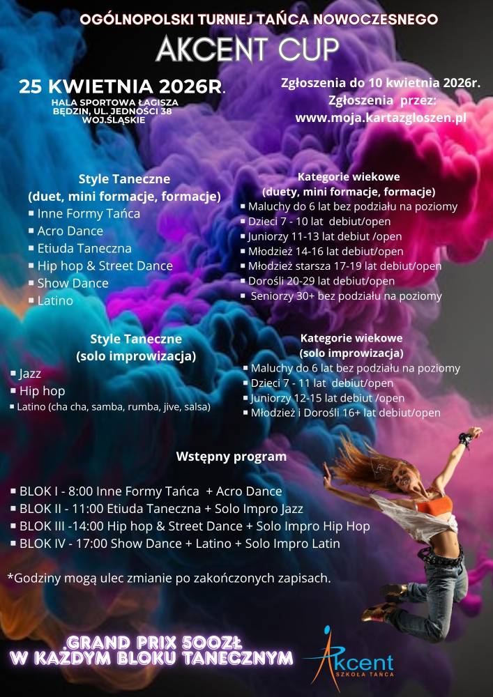 . Konkurencje taneczne:- HIP-HOP & STREET DANCE (hip-hop, new style, new age, house, funky, dancehall, break dance – bez rekwizytów)- ETIUDA TANECZNA (jazz, modern, taniec współczesny, balet – bez rekwizytów – ewentualnie wstążki)- INNE FORMY TAŃCA (cheerleaders, choreografie oparte na większej ilości stylów tanecznych tzw.mixy – rekwizyty akceptujemy)- Latino (samba, chacha, rumba, paso-doble, jive, bachata, salsa, merengue – bez dużych rekwizytów, tylko małe rekwizyty – część garderoby: wachlarz, kapelusz, okulary)- Acro Dance (akrobatyka z elementami tańca – bez rekwizytów)- Show Dance (show dance, teatr tańca, burleska, sexy dance, chair dance, taniec z hula hop i inne – rekwizyty akceptujemy)5. W kategoriach wiekowych: duety/mini formacje/formacjea) Dzieci Młodsze do lat 6 – BEZ PODZIAŁU NA POZIOMYb) Dzieci Starsze w wieku od 7 do 10 lat – Debiut/Openc) Juniorzy w wieku od 11 do 13 lat – Debiut/Open