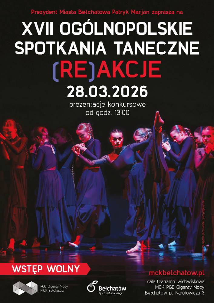 Zapraszamy na Ogólnopolskie Spotkania Taneczne (Re)akcje 2026, które odbędą się 28.03.2026 w Miejskim Centrum Kultury w Bełchatowie. Festiwal skierowany jest do teatrów tańca oraz formacji modern,. Nagrody finansowe w kategorii teatr: I miejsce – 800 zł, II miejsce – 600 zł,III miejsce – 400 zł, w kategorii formacje modern 12 plus: I miejsce – 800 zł., II miejsce – 600 zł, III miejsce – 400 zł, w kategorii solo/duet: modern 12plus: I miejsce – 300 zł., II miejsce – 200 zł, III miejsce – 100 zł ,wyróżnienia w postaci statuetek zielonych i czerwonych jabłek oraz Grand Prix dla najlepszej prezentacji w wysokości 1500 zł. Wszystkim zwycięzcom 1 miejsc oraz zdobywcom Grand Prix przysługuje bezpłatna akredytacja na rok 2027. Regulamin dostępny na FB Reakcje.