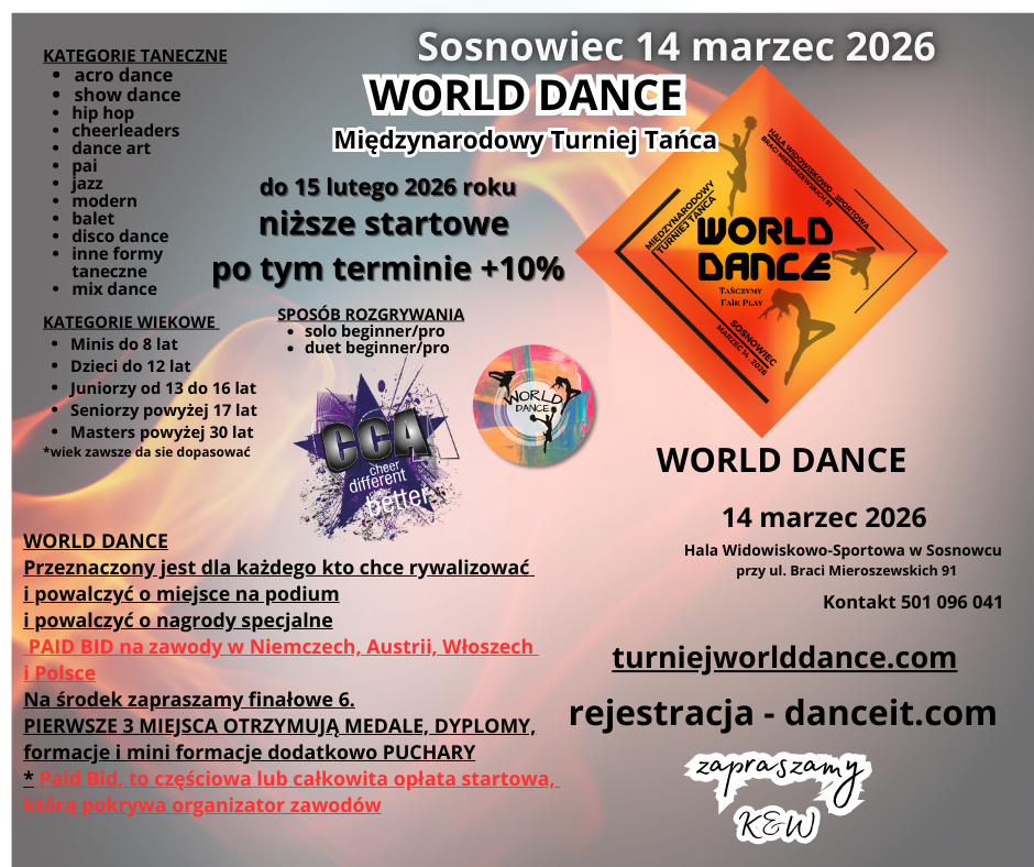 Startujesz raz — wygrywasz więcej niż medal.WORLD DANCE to turniej, który otwiera drzwi: od Sosnowca, przez Niemcy, aż po USA.