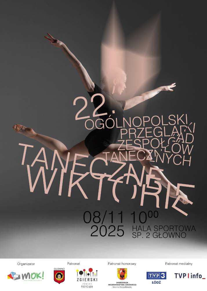22. Ogólnopolski Przegląd Zespołów Tanecznych TANECZNE WIKTORIE Głowno 2025 odbędzie się 8 listopada o godzinie 10.00 w hali sportowej SP 2 w Głownie. Regulamin i karta zgłoszenia dostępne na stronie organizatora konkursu Miejskiego Ośrodka Kultury w Głownie mok.glowno.pl Na zgłoszenia czekamy do 23 października. Impreza pod patronatem Burmistrza Głowna i Starosty Zgierskiego, honorowym patronatem Marszałka Województwa Łódzkiego, patronatem medialnym TVP 3 Łódź