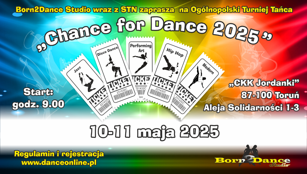 Zapraszamy na VII edycję Chance for Dance do Torunia w dniu 10 i 11 maja 2025 (sobota, niedziela). Turniej odbędzie się w niesamowitym miejscu jakim jest CKK Jordanki.Na tej pięknej scenie będą rozgrywane zawody w następujących konkurencjach :- Disco Dance - solo, duety,- Disco Dance - Mini Formacje i Formacje (Easy i Open)- Hip Hop - solo, duety,- Hip Hop - Mini Formacje i Formacje (Easy i Open)- Hip Hop Lyrical Improvisation - HIL solo- Performing Art Improvisation - solo PAI Jazz, solo PAI Modern- Jazz - Mini Formacje i Formacje (Easy i Open)- Modern - Mini Formacje i Formacje ( Easy i Open)- Inne Formy Tańca - Mini Formacje i Formacje- Formacje OPEN 31+ - bez podziału na styl tanecznyRejestracja i regulamin ukaże się do dnia 28.02.2025 - www.danceonline.pl"Chance for Dance 2025" to szansa na wspaniałą taneczną rywalizację w niesamowitej oprawie.Wykorzystajcie swoją szansę na TANIEC !!!OrganizatorzyMałgorzata i Mariusz Mikołajek