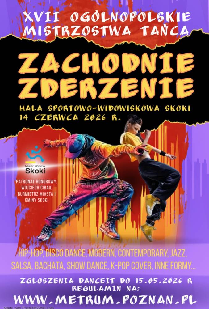 Witamy wszystkich miłośników tańca i zapraszamy do udziału w kolejnych XVII Ogólnopolskich Mistrzostwach Tańca ,,Zachodnie Zderzenie” dla szkół Tańca, Szkół Podstawowych, domów kultury i wszystkich instytucji zajmujących się tańcem.