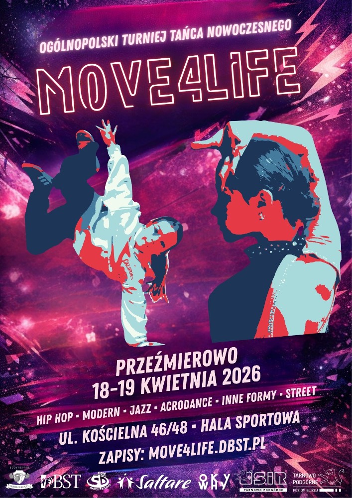 Ogólnopolski Turniej Tańca Nowoczesnego MOVE4LIFE to dwa dni pełne emocji, pasji i czystej energii na parkiecie!Hip hop, modern, jazz, acrodance, street i inne formy – bez ograniczeń, bez schematów, tylko taniec i flow 💃🕺