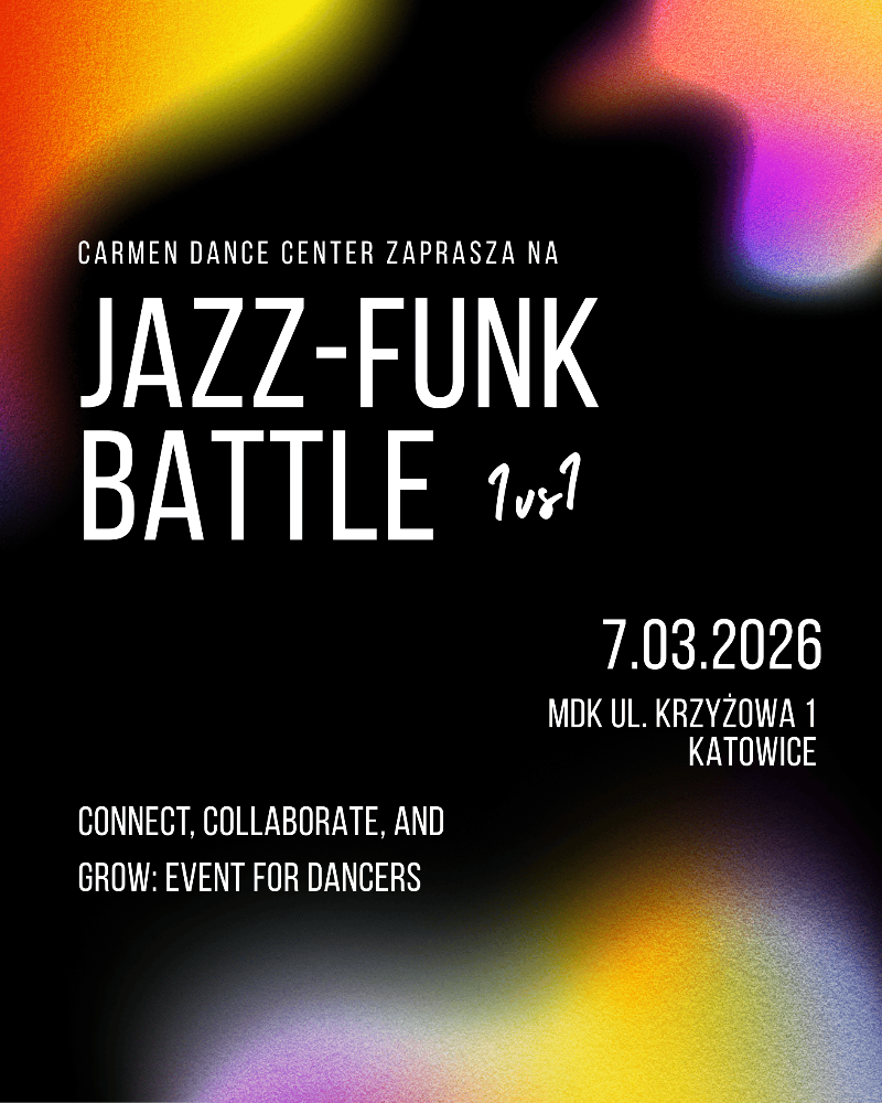Zapisy na mail:taniec@cdc-silesia.pl, w tytule: Jazz-Funk Battle,w treści maila napisać:Imię Nazwisko, Wiek, Miasto, Kategoria Wiekowa