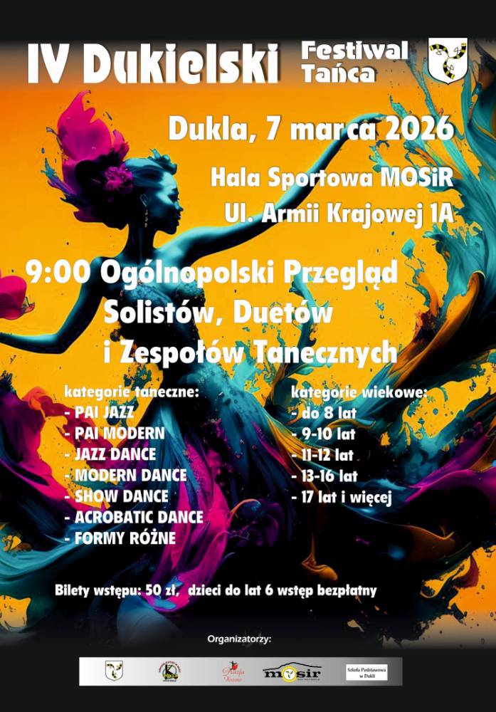 Ośrodek Kultury w Dukli, Studio Tańca “Gracja” serdecznie zaprasza na “IV Dukielski Festiwal Tańca”. Jest to coroczne wydarzenie, które przyciąga tancerzy z całego kraju. Atmosfera jest pełna emocji, energii i zaciętej rywalizacji, a jednocześnie widać ogromną pasję i radość z tańca. Dla tancerzy jest to świetna okazja do wymiany doświadczeń, spotkania z innymi pasjonatami, a także do zdobycia cennych wskazówek od profesjonalnych sędziów.