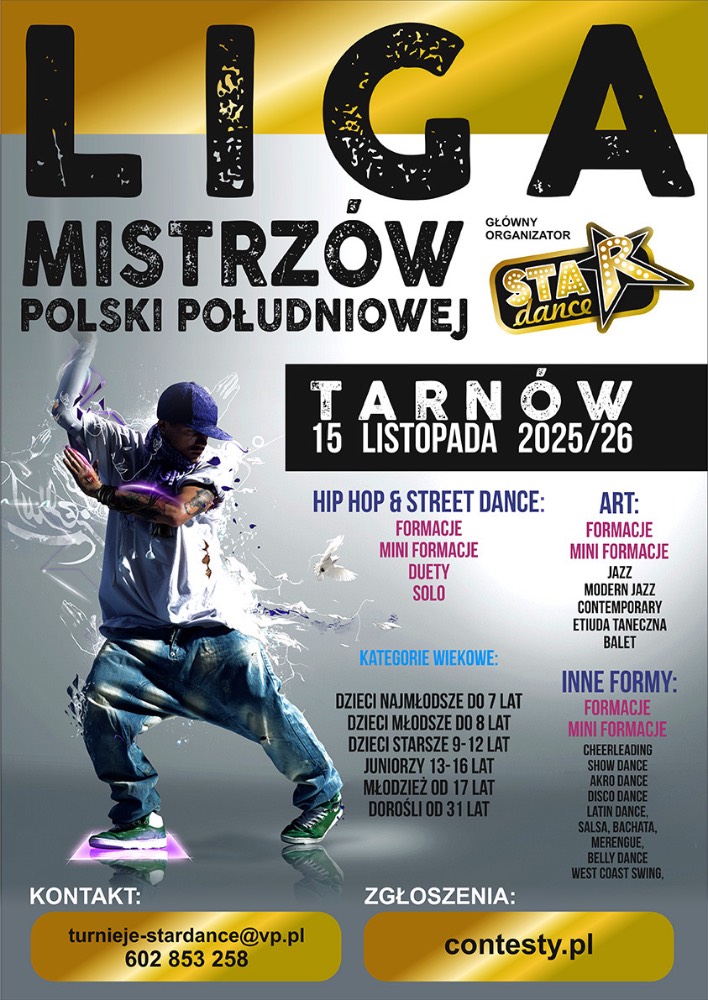 Uczestnictwo w turnieju jest dobrowolne i jednoznaczne z wyrażeniem zgody na przetwarzanie danych osobowych, w tym wizerunku. Administratorem danych osobowych, w tym wizerunku uczestników turnieju jest firma Stardance Kraków nip: 872-264-07-37.