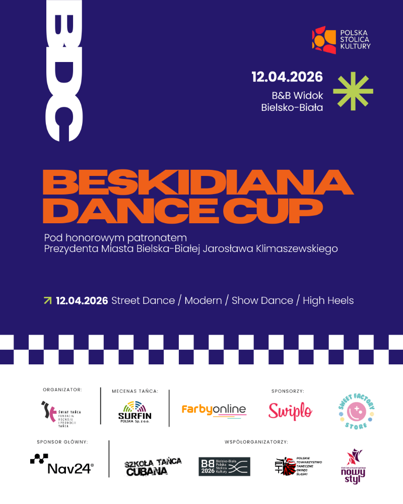 12 kwietnia 2026 spotykamy się w Bielsku‑Białej na wyjątkowym święcie tańca – Beskidiana Dance Cup w stylach scenicznych. Tancerze z całej Polski zaprezentują się w nowoczesnych odsłonach Modern, Show Dance, Street Dance i High Heels.