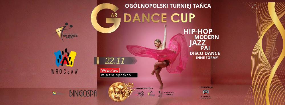 Uczniowski Klub Sportowy RM Dance SPORT Kiełczów oraz Fundacja DGAR Feniks serdecznie zapraszają na Ogólnopolski Turniej Tańca Sportowego "GAR Dance CUP", który odbędzie się 22 listopada 2025r. we Wrocławiu.