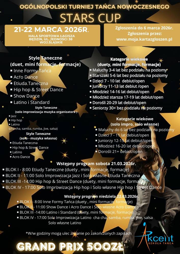 z uwzględnieniem kategorii wiekowych.4. Konkurencje taneczne:- HIP-HOP & STREET DANCE (hip-hop, new style, new age, house, funky, dancehall, break dance – bez rekwizytów)- ETIUDA TANECZNA (jazz, modern, taniec współczesny, balet – bez rekwizytów – ewentualnie wstążki)- INNE FORMY TAŃCA (cheerleaders, choreografie oparte na większej ilości stylów tanecznych tzw.mixy – akceptujemy rekwizyty)- Latino (samba, chacha, rumba, paso-doble, jive, bachata, salsa, merengue – bez dużych rekwizytów, tylko małe rekwizyty – część garderoby: wachlarz, kapelusz, okulary)