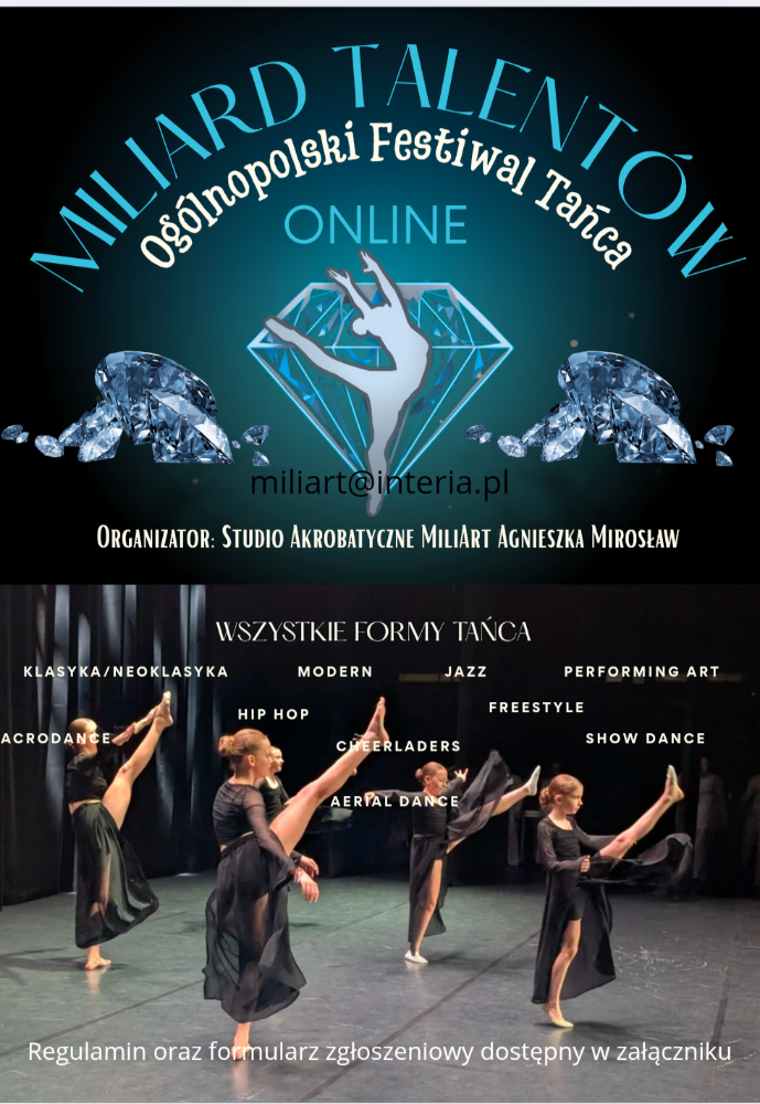 Kochasz taniec? Chciałbyś wziąć udział w konkursie tanecznym bez przemieszczania się na drugi koniec mapy? Idealnie się składa! Miliard Talentów to prawdziwa taneczna rewolucja mająca na celu dać szansę udziału w rywalizacji sportowej wszystkim osobom uwielbiającym taniec. Nie ważne czy jesteś początkującym, amatorem czy profesjonalistą. Nieważne też jaki styl tańca preferujesz. Festiwal otwarty jest na każdy możliwy rodzaj tańca. Możesz wysłać nagranie z zawodów stacjonarnych, ale może to być też filmik z sali treningowej, boiska, sceny czy własnego pokoju. Tańcz i dziel się tą pasją. Jako solista, w parze, trio a nawet w dużej grupie- wszyscy mają szansę na super tytuły i imponujące miejsca, które przyznają Wam profesjonalni sędziowie. Przygotowaliśmy nagrody dla laureatów, ale także dodatkowe wyróżnienia, odznaczenia dla choreografów, a każdy z Was może powalczyć o największy puchar i zaszczyt jakim jest GRAND PRIX przyznawane dla najlepiej wykonanej prezentacji.