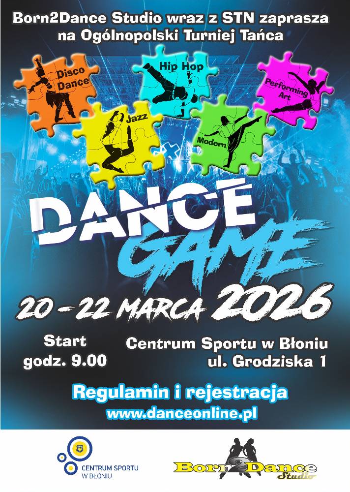 20-22 marca 2026 r w gościnnych progach Centrum Sportu w Błoniu odbędzie się Ogólnopolski Turniej Tańca pod nazwą „DANCE GAME 2026 ”. Koniecznie bądźcie z nami , aby zagrać w naszą taneczną grę.Podział konkurencji na poszczególne dni: