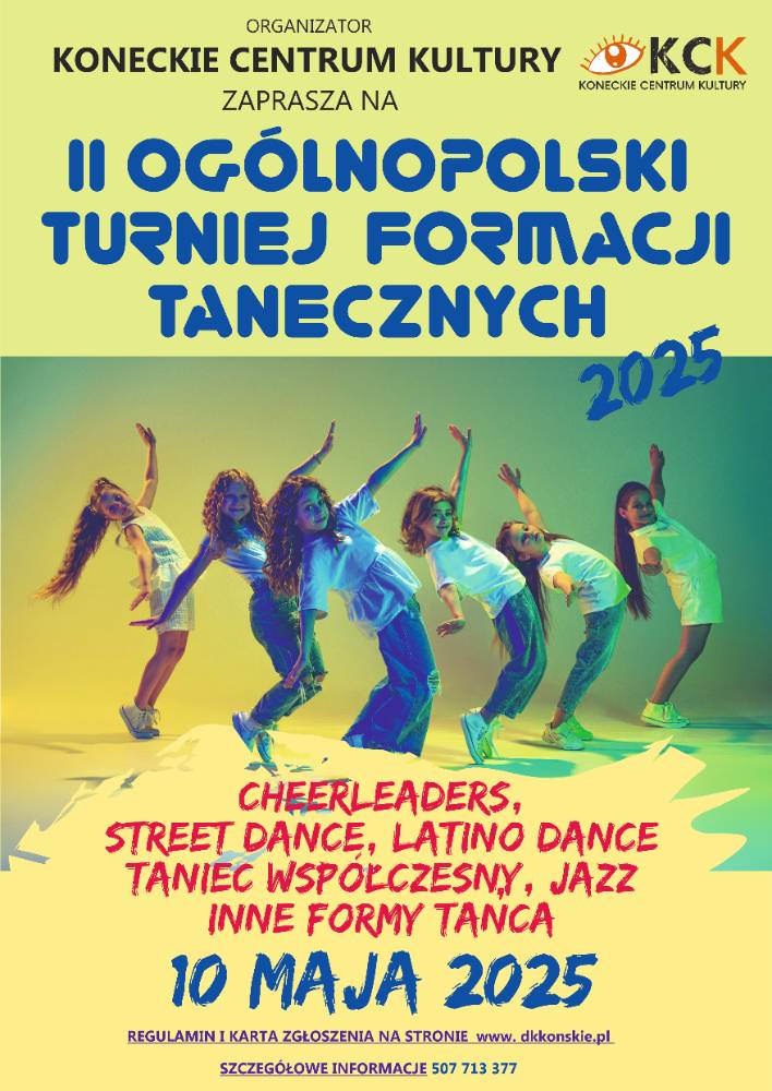 Regulamin i karta zgłoszeniowa:https://dkkonskie.pl/imprezy/ii-ogolnopolski-turniej-formacji-tanecznych-2025/